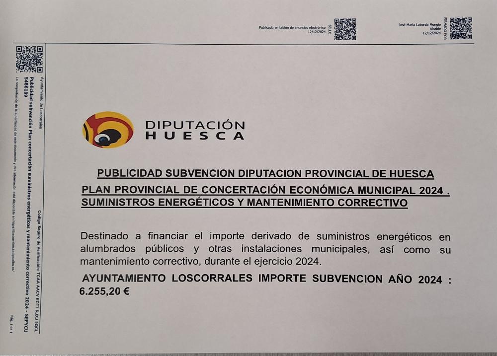 Subvención plan provincial de concertación económica municipal 2024. Suministros energéticos y mantenimiento correctivo: Importe 6.255,20 €